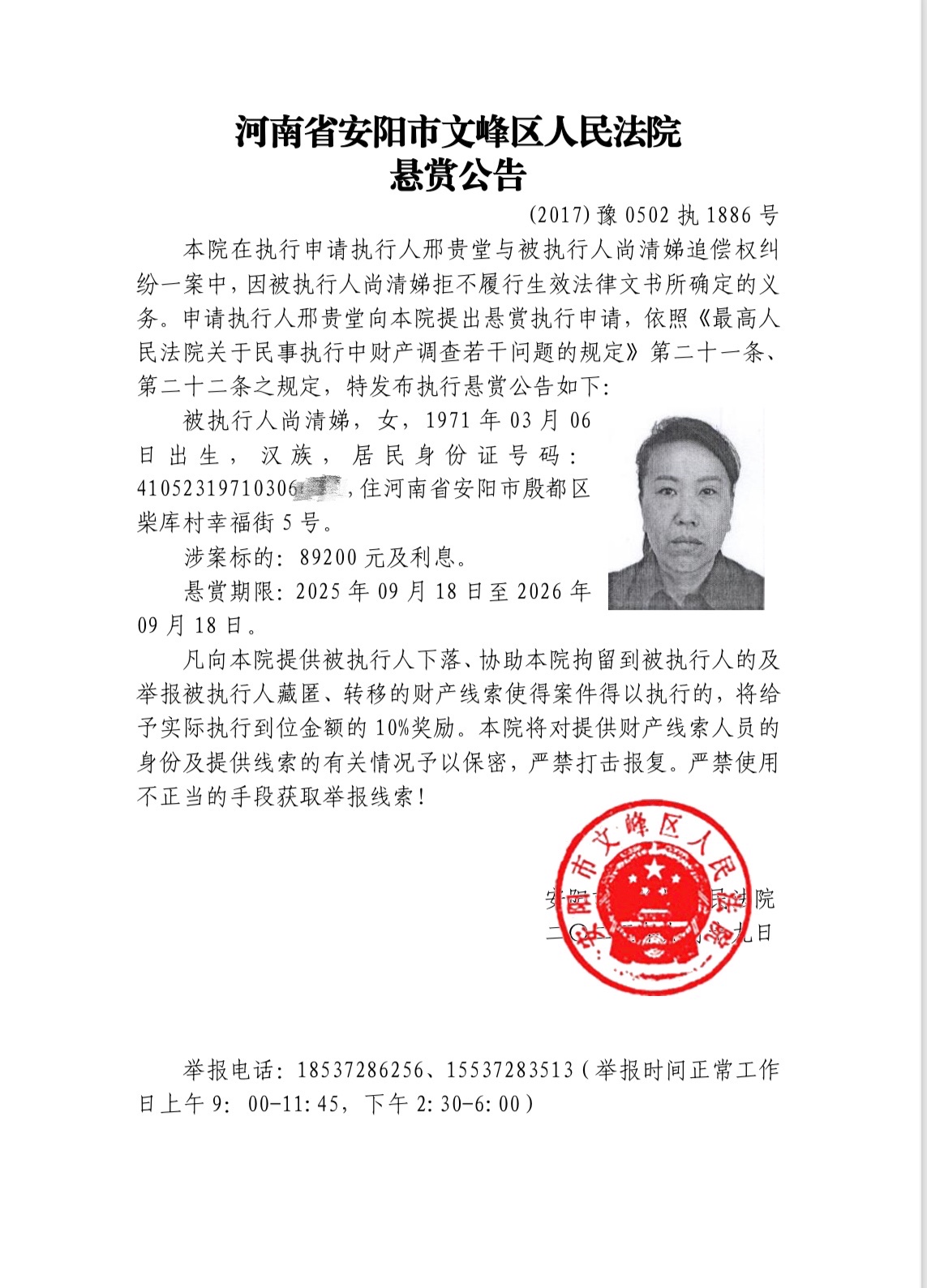 现公布尚清娣个人信息,鼓励广大群众检举揭发其财产线索,凡是向本院提供被执行人尚清娣财产线索或提供被执行人尚清娣下落,协助本院将尚清娣拘留并将案款执行到位的,给予实际执行到位金额的10%奖励。对举报人的身份、举报内容和奖励情况严格保密。