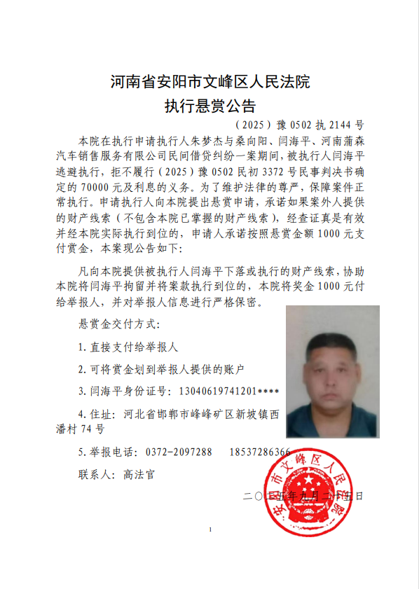 申请执行人朱梦杰与桑向阳、闫海平、河南蒲森汽车销售服务有限公司民间借贷纠纷一案,因被执行人闫海平逃避执行,拒不履行生效法律文书所确定的义务。为切实维护权利人的合法权益,根据申请执行人申请,对被执行人闫海平实施悬赏执行。