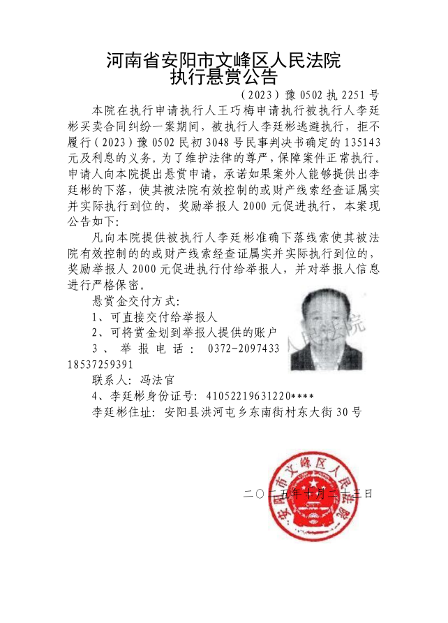 现公布李廷彬个人信息,鼓励广大群众检举揭发其财产线索,凡向本院提供被执行人李廷彬准确下落线索使其被法院有效控制的的或财产线索经查证属实并实际执行到位的,奖励举报人2000元促进执行付给举报人。对举报人的身份、举报内容和奖励情况严格保密。