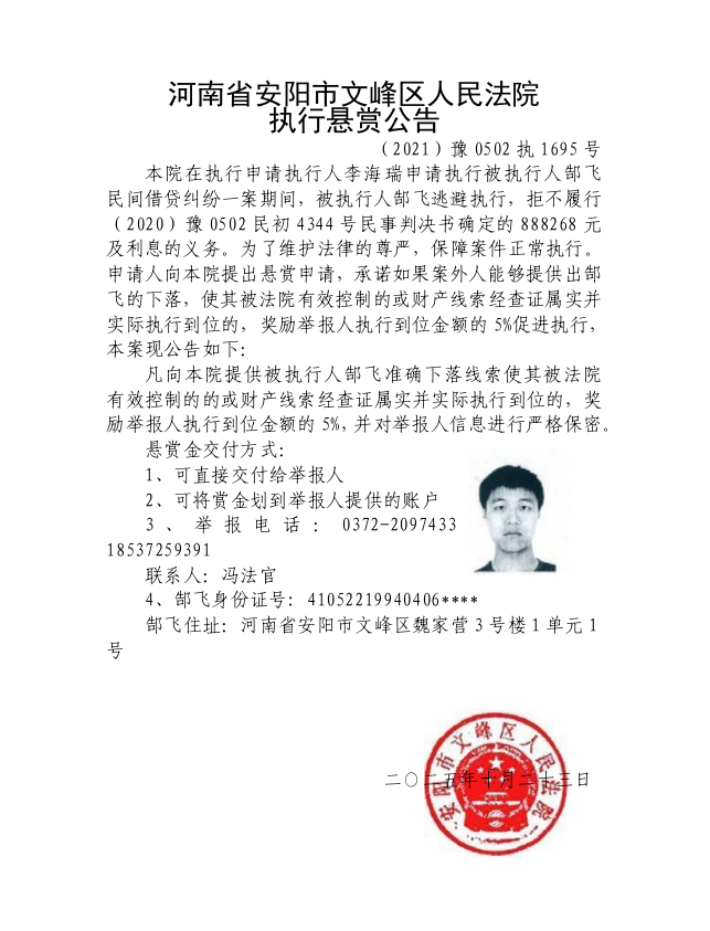 现公布郜飞个人信息,鼓励广大群众检举揭发其财产线索,凡向本院提供被执行人郜飞准确下落线索使其被法院有效控制的的或财产线索经查证属实并实际执行到位的,奖励举报人执行到位金额的5%。对举报人的身份、举报内容和奖励情况严格保密。