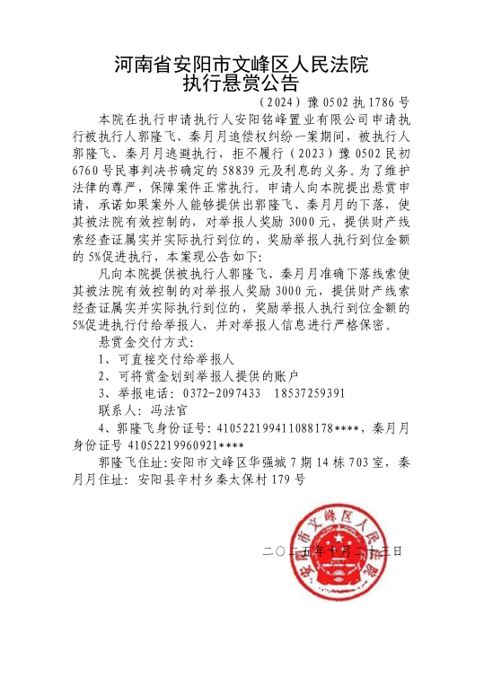 申请执行人安阳铭峰置业有限公司申请被执行人郭隆飞、秦月月民间借贷纠纷一案中,因被执行人郭隆飞、秦月月逃避执行,拒不履行生效法律文书所确定的义务。为切实维护权利人的合法权益,根据申请执行人申请,对被执行人郭隆飞、秦月月实施悬赏执行。现公布郭隆飞、秦月月个人信息,鼓励广大群众检举揭发其财产线索,凡向本院提供被执行人郭隆飞、秦月月准确下落线索使其被法院有效控制的对举报人奖励3000元,提供财产线索经查证属实并实际执行到位的,奖励举报人执行到位金额的5%促进执行付给举报人。对举报人的身份、举报内容和奖励情况严格保密。