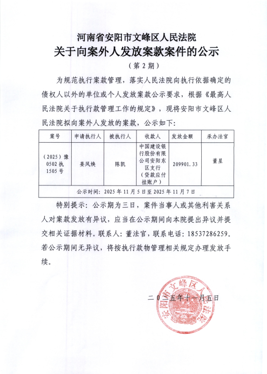 安阳市文峰区人民法院关于向案外人发放案款的公示(2025年第二期)