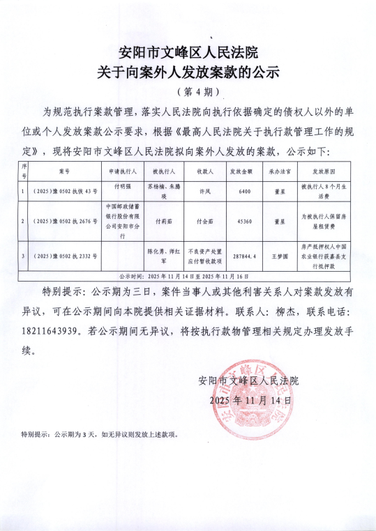 安阳市文峰区人民法院关于向案外人发放案款的公示(2025年第四期)