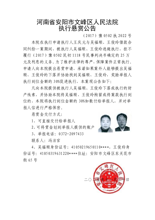 申请执行人王庆元与吴福顺、王俊玲借款合同纠纷一案中,因被执行人吴福顺、王俊玲逃避执行,拒不履行(2017)豫0502民初1118号民事判决书确定的义务。为切实维护权利人的合法权益,根据申请执行人申请,对被执行人吴福顺、王俊玲实施悬赏执行。