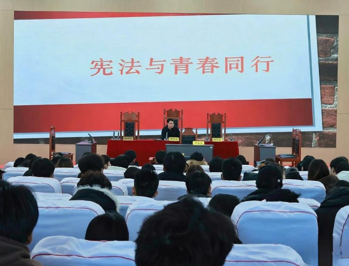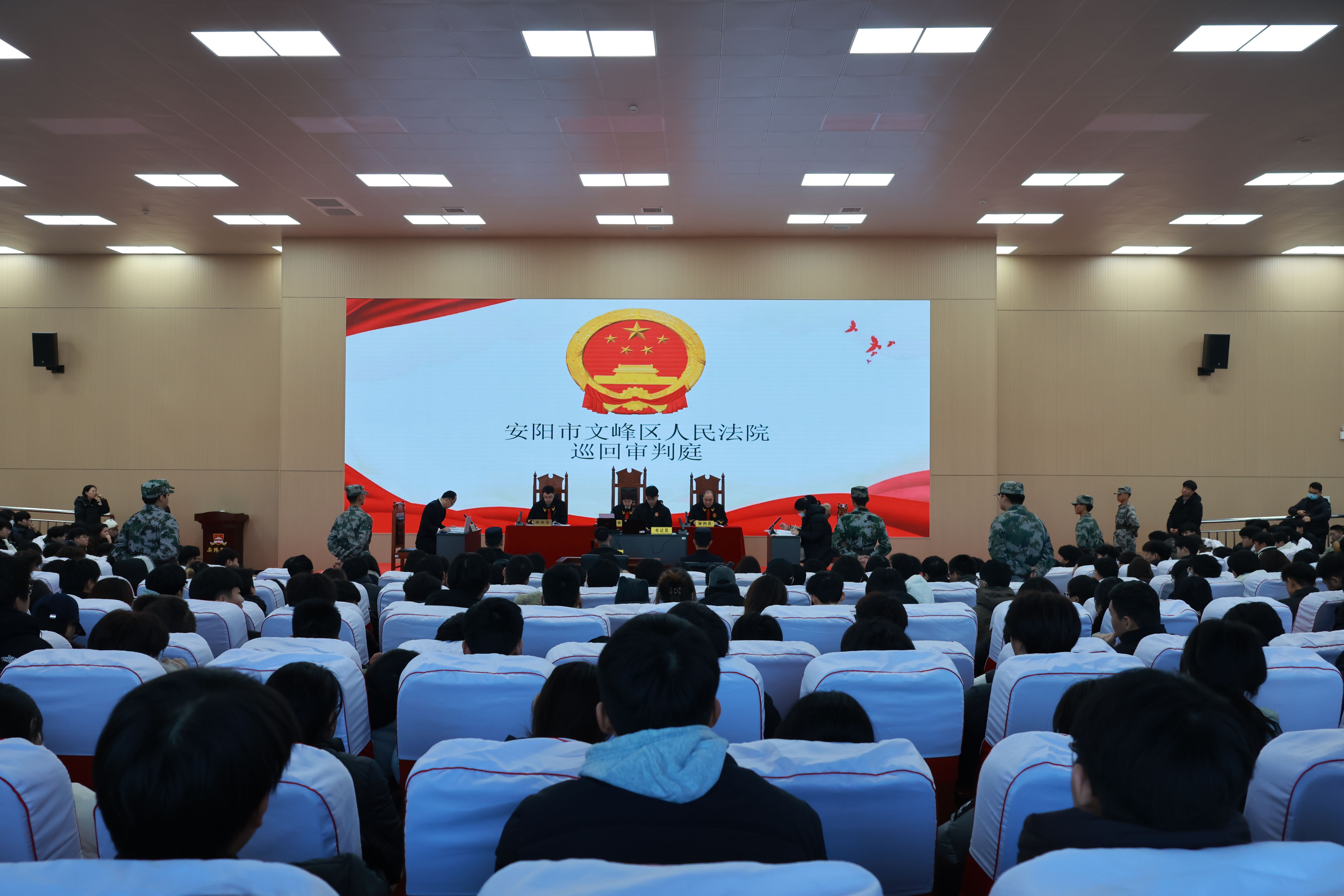 国徽高悬,法槌铿锵。12月3日下午,安阳市文峰区人民法院将巡回审判法庭与宪法宣传课堂同步“搬”进安阳学院,以“庭审实景观摩+宪法主题宣讲”的创新形式,为600余名师生送上了一场沉浸式法治教育盛宴。此次活动既是文峰法院与安阳学院“校园安全先议办公室”合作的深化实践,更是国家宪法日来临之际播撒法治种子的生动举措。