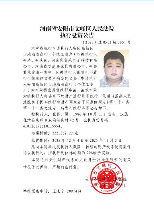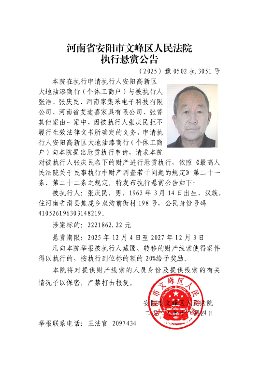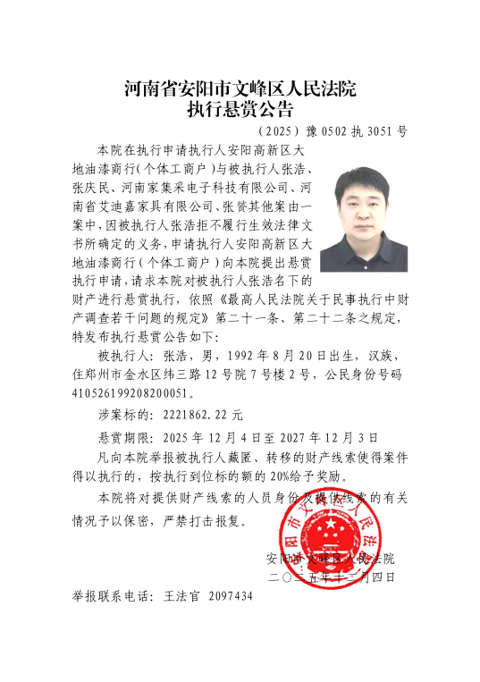 申请执行人安阳高新区大地油漆商行(个体工商户)申请执行与被执行人张浩、张庆民、河南家集采电子科技有限公司、河南省艾迪嘉家具有限公司、张贇其他案由一案中,因被执行人张浩、张庆民、、张贇拒不履行(2025)豫0502民初4652号民事判决书确定的义务。为切实维护权利人的合法权益,根据申请执行人申请,对被执行人张浩、张庆民、、张贇实施悬赏执行。