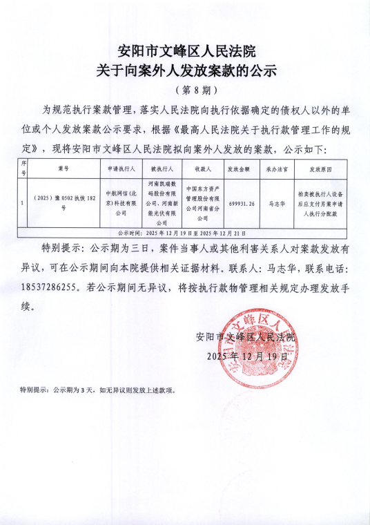 安阳市文峰区人民法院关于向案外人发放案款的公示(2025年第八期)