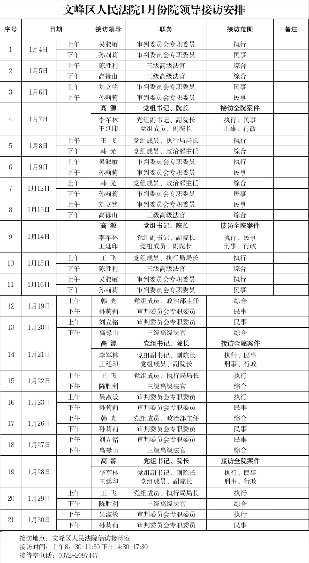 安阳市文峰区人民法院2026年1月领导接访公示