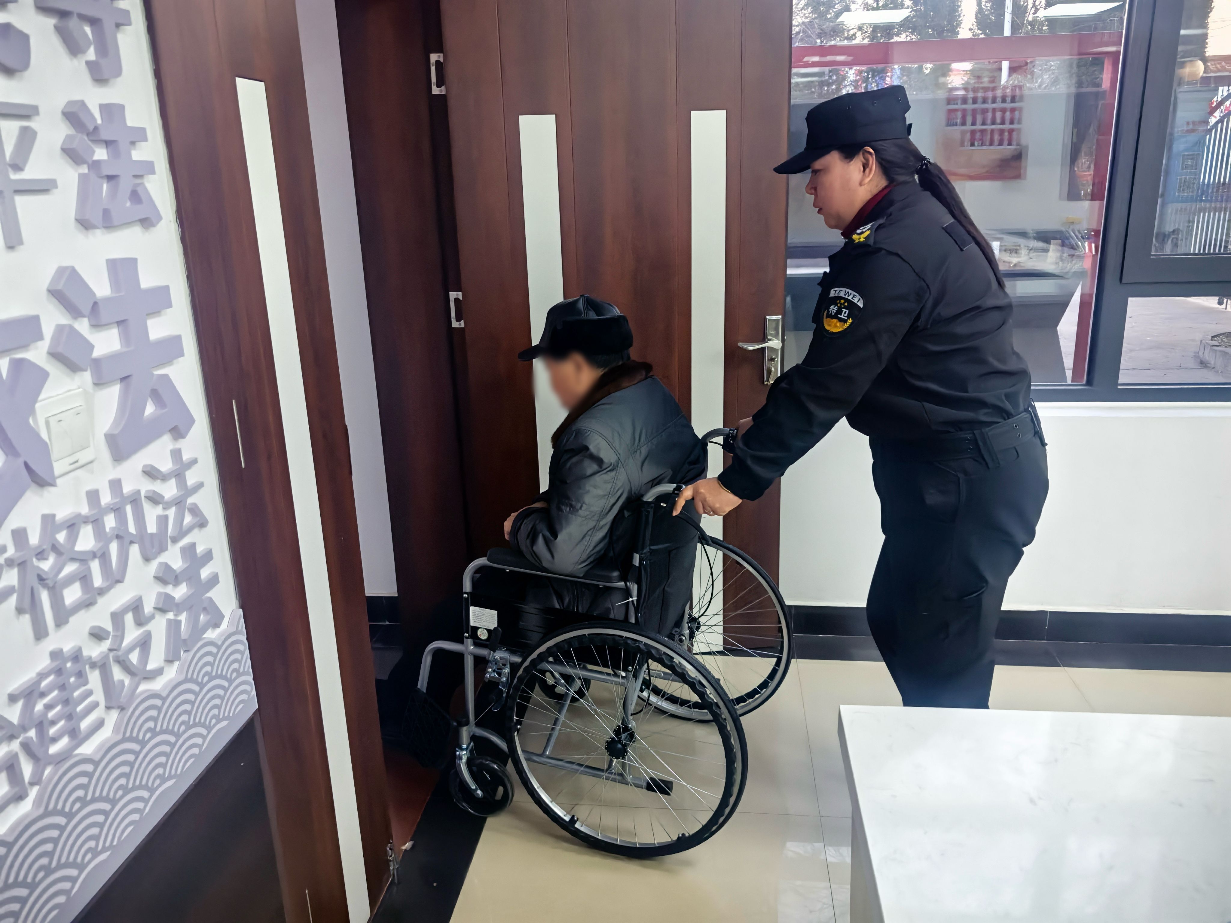 那天早晨,宝莲寺法庭的诉讼服务中心像往常一样忙碌。这时,一位坐着轮椅的老人缓缓出现在门口——他是黄大爷,因腿脚不便,只能依靠轮椅行动。这一幕,立刻引起了法庭工作人员的注意。安保人员快步上前,一边轻声问候,一边稳稳扶住轮椅,协助他通过无障碍通道,顺利进入大厅。导诉员见状主动迎上,全程陪同在黄大爷身旁,耐心协助他填写材料、办理立案手续。从进门到坐下,一路畅通,黄大爷原本微蹙的眉头渐渐舒展。