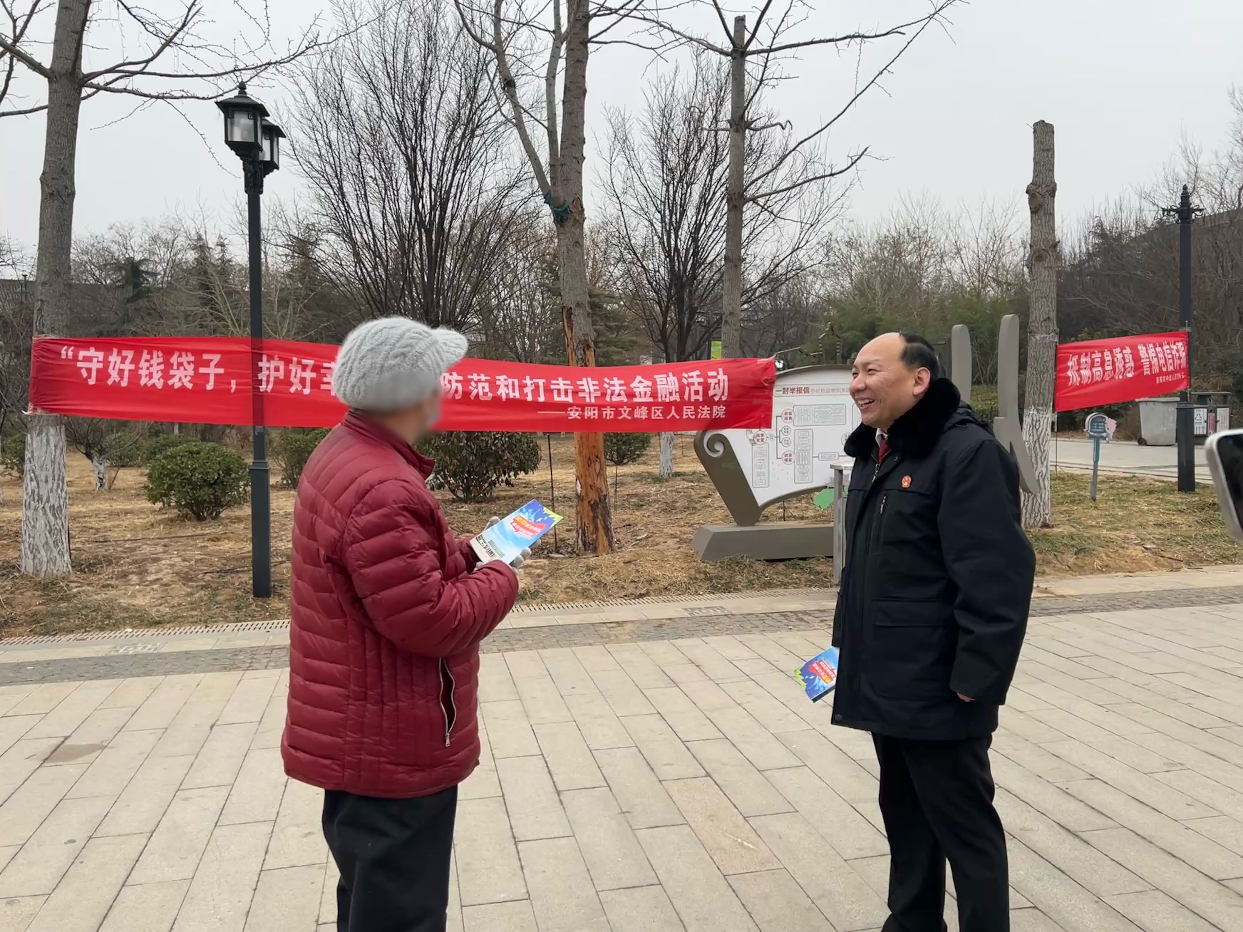 年关岁末是非法集资骗局的高发期,为切实守护群众 “钱袋子”,筑牢辖区金融安全屏障,1月29日下午,安阳市文峰区人民法院刑事审判庭走进彰德游园广场开展防范非法集资专项普法宣传活动,用专业法律知识为群众送上新春“财产安全大礼包”。