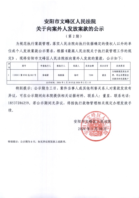 安阳市文峰区人民法院关于向案外人发放案款的公示(2026年第二期)