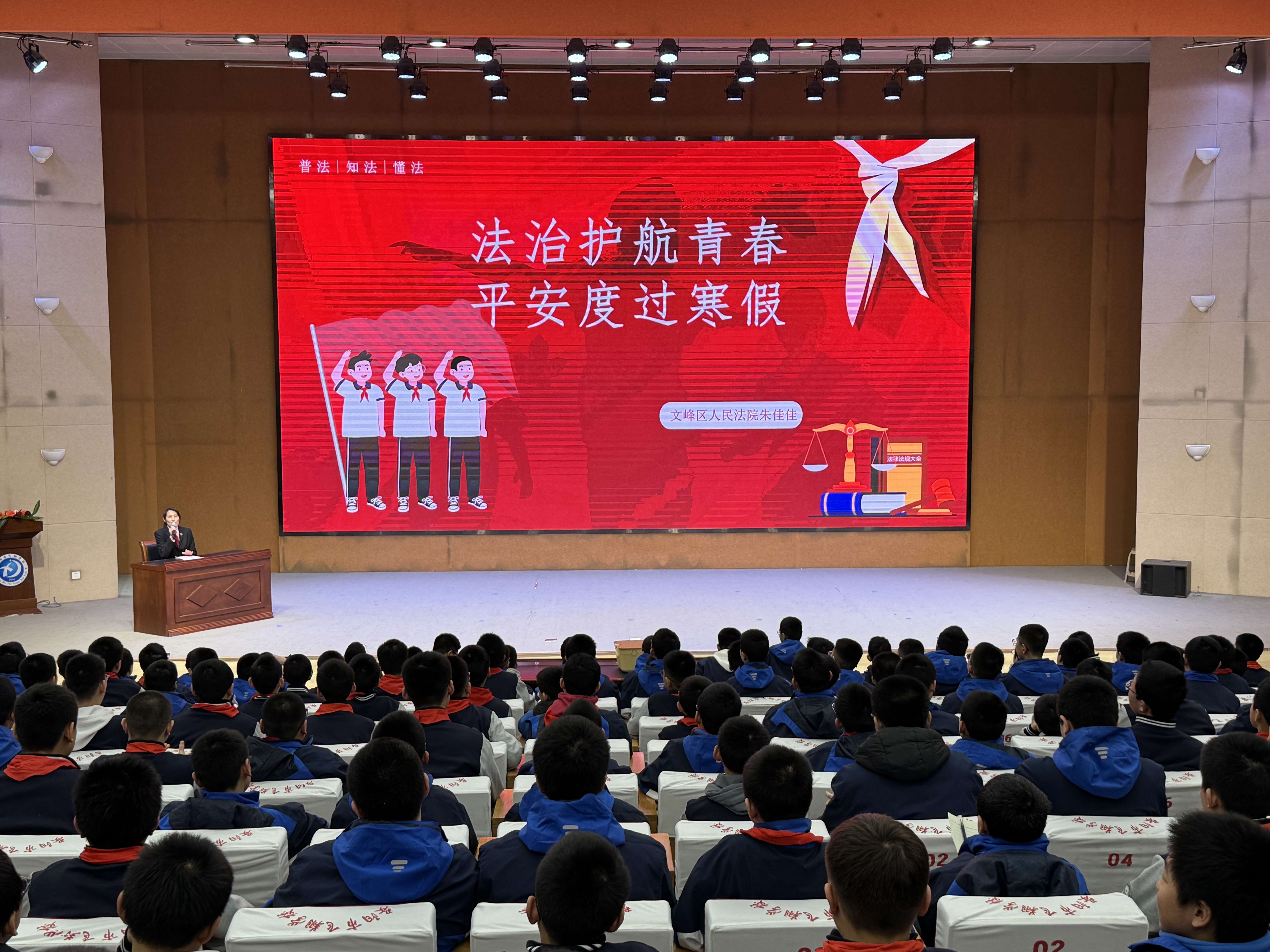 寒假将至,为增强青少年法治意识,筑牢假期安全防线,2月4日下午,安阳市文峰区人民法院干警朱佳佳走进安阳市飞翔中学,为同学们带来了一堂生动的法治辅导课。课堂聚焦新法解读、交通安全与网络安全三大主题,用真实案例敲响警钟,引导同学们知法守法,安全度假。