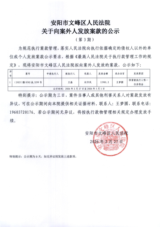 安阳市文峰区人民法院关于向案外人发放案款的公示(2026年第三期)