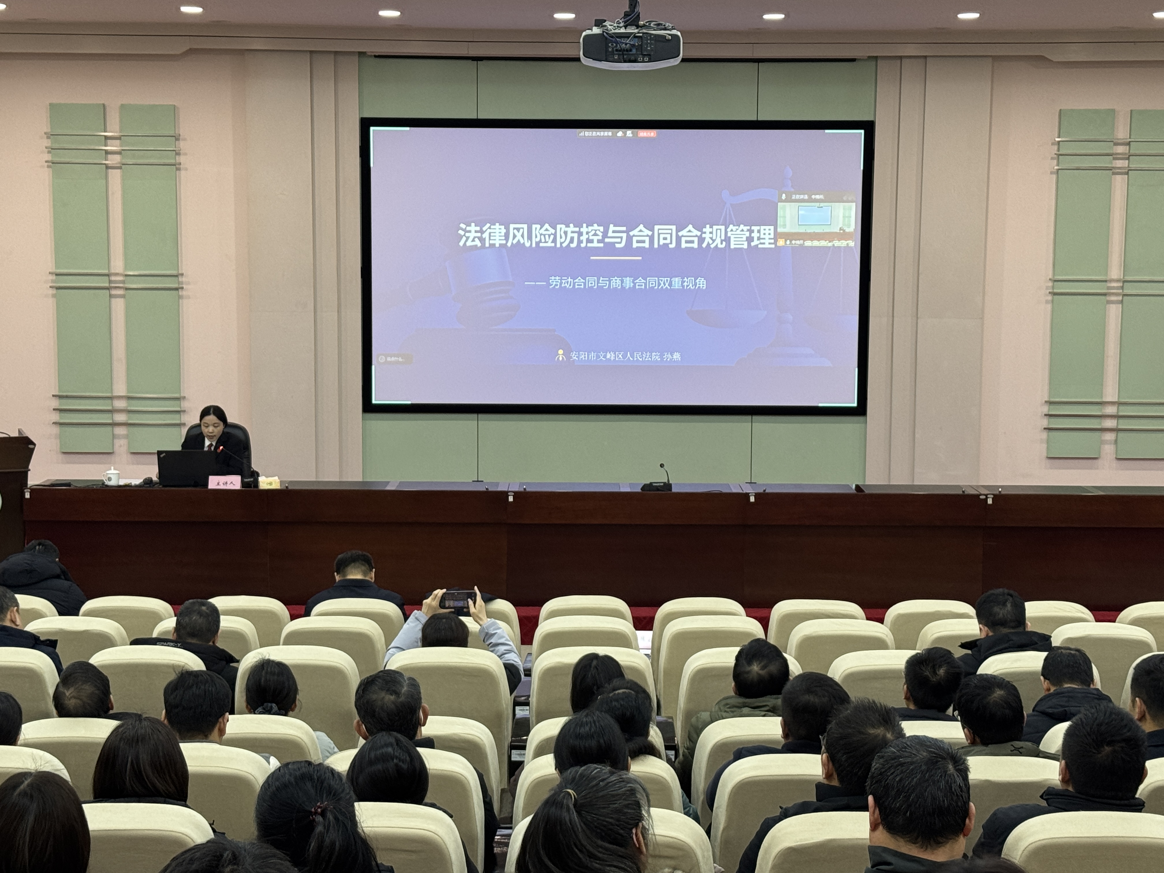 孙燕法官讲的是“法律风险防控与合同合规管理”。从劳动合同怎么签才规范,到商事合同里哪些条款最容易“踩雷”;从科研成果转化的商业秘密保护,到日常工作中怎么留证据、怎么应对纠纷。所有参会人员时而专心听课,时而认真记录,屋内只有孙燕娓娓道来的声音和纸笔摩擦的沙沙声。
