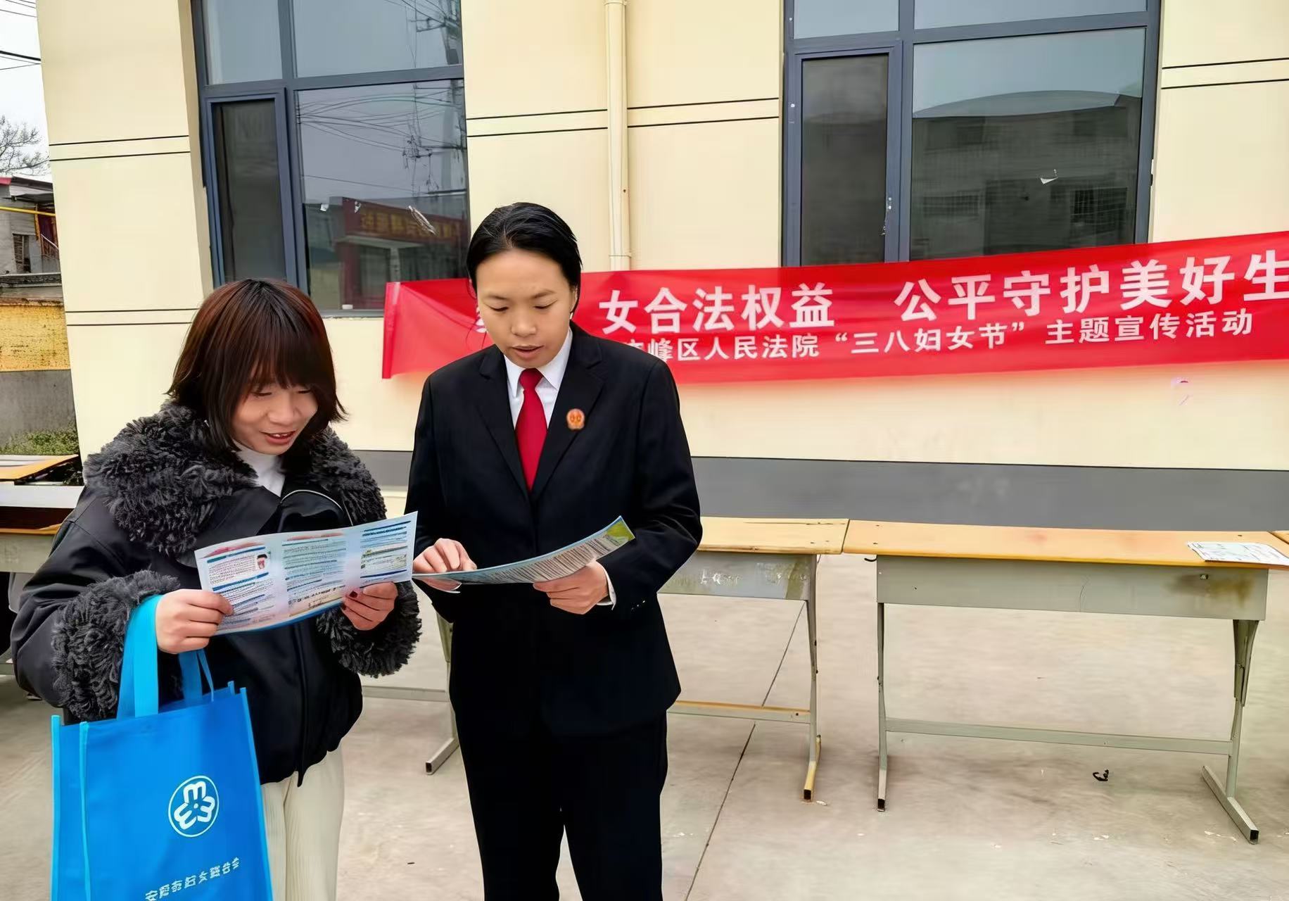 上午9:30,宝莲寺镇郭村集村委会门口,宝莲寺法庭法官李佳玉的普法宣传摊位刚摆好,就有路过的大姐凑过来。“大姐,我们是法院的,妇女节给您送法律知识来了。”李佳玉递过去一本小册子,“这上头写的是咋保护咱妇女权益,我给您讲讲......。”