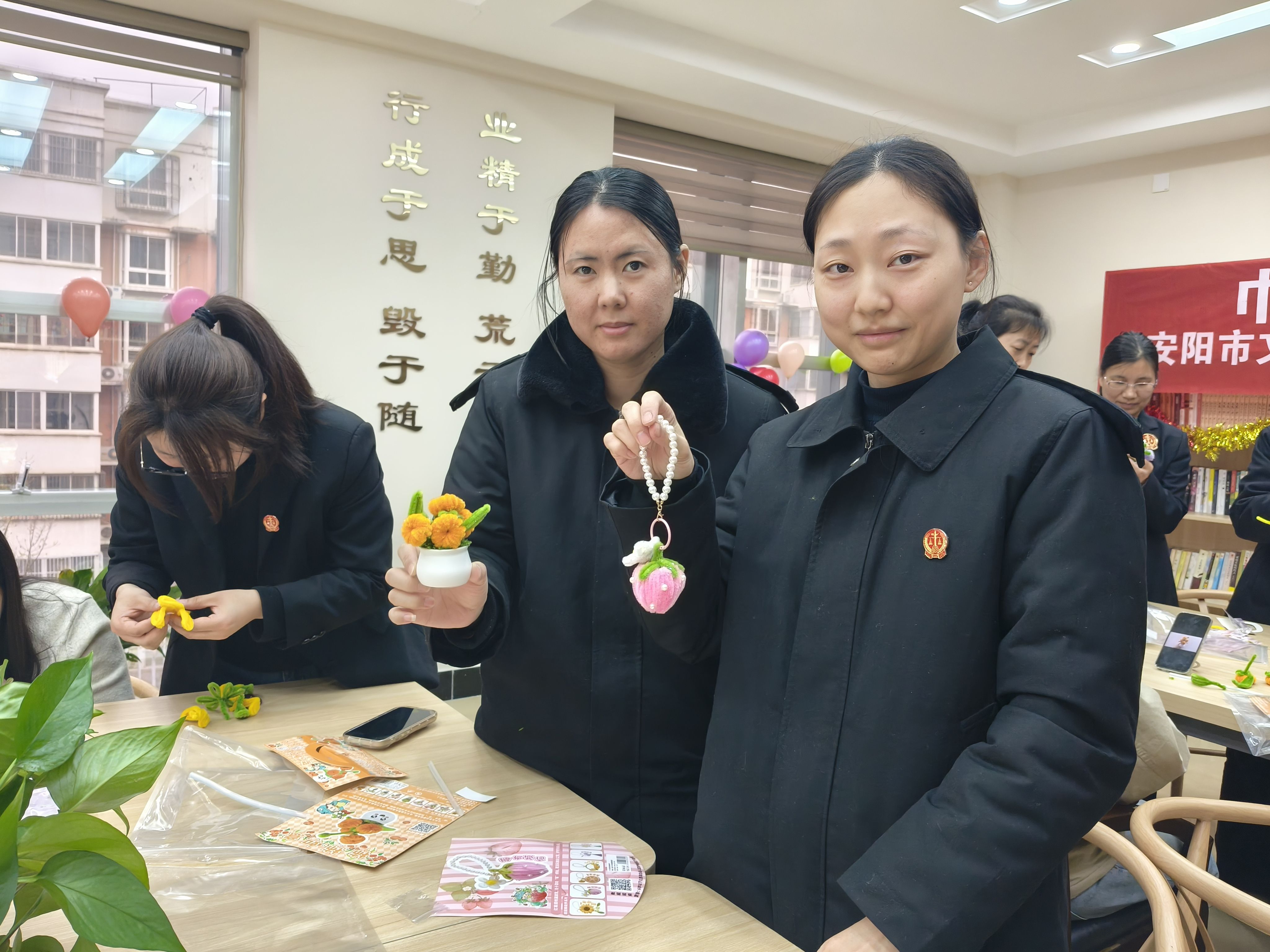 角落里,几个年轻姑娘比赛谁做的钥匙链好看。执行局的小周做了个小太阳:“我要挂包上,天天看着心情好。”办公室的王姐做得慢,但认真,做完一盆小多肉,端起来左看右看:“放我办公桌上,工作累了看一眼。”