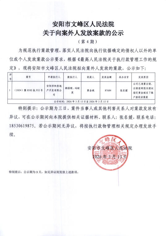 安阳市文峰区人民法院关于向案外人发放案款的公示(2026年第四期)