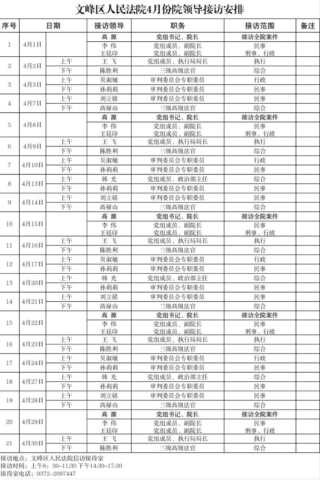 安阳市文峰区人民法院2026年4月领导接访公示